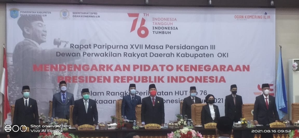 OGAN KONERING ILIR I KABARINTI COM I Rapat Paripurna XVII Masa Persidangan III Dewan Perwakilan Rakyat Daerah (DPRD) Kabupaten Ogan Komering Ilir (OKI), mendengarkan Pidato Kenegaraan Presiden Republik Indonesia dalam rangka peringatan Hari Ulang Tahun (HUT) ke 76 Kemerdekaan Republik Indonesia Tahun 2021.