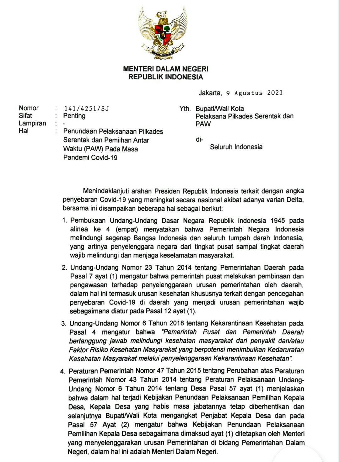 OGAN KOMERING ILIR I KABARINTI.COM I Pemilihan Kepala Desa (Pilkades) serentak di Kabupaten Ogan Komering Ilir (OKI) yang di jadwalkan 25 Agustus 2021 terancam mundur, alasannya dengan keluar surat edaran Menteri Dalam Negeri (Mendagri) RI No : 141/421/SJ tertanggal 9 Agustus 2021 Prihal Penundaan Pelaksanaan Pilkades dan Pemilihan Antar Waktu (PAW) Pada Massa Pandemi Covid 19.