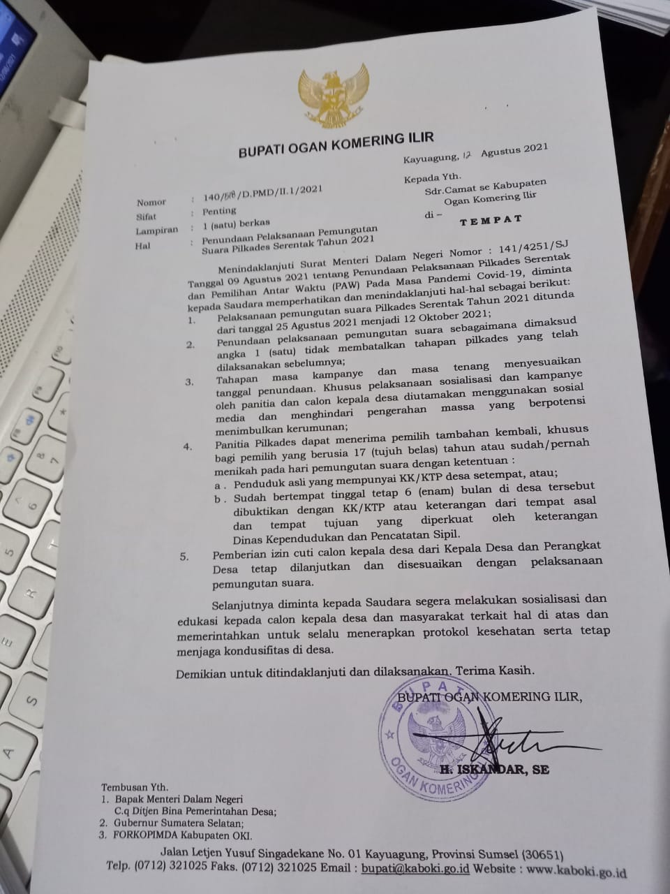 “Secara resmi Bupati OKI mengeluarkan surat keputusan penundaan pemungutan suara pilkades serentak tahun 2021,” jelasnya, Kamis (12/8/2021).