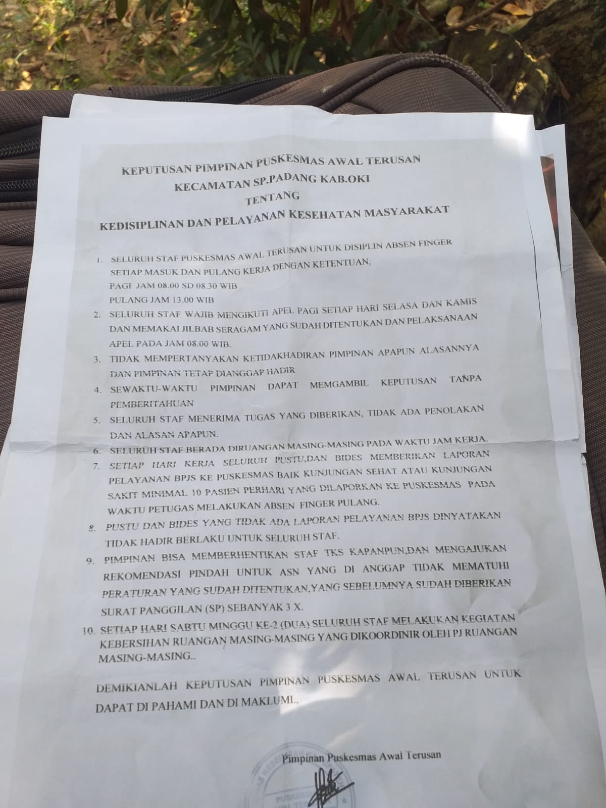 Diantaranya, lanjutnya, seperti di point 3 ; tidak mempertanyakan ketidakhadiran pimpinan apapun alasannya dan pimpinan tetap dianggap hadir, point 4; sewaktu waktu pimpinan dapat mengambil keputusan tanpa pemberitahuan, dan point 5; seluruh staf menerima tugas yang diberikan dan tidak ada penolakan serta alasan apapun. “Aturan tersebut diduga tidak ada persetujuan dari pihak Dinas Kesehatan Kabupaten OKI,” ungkapnya.