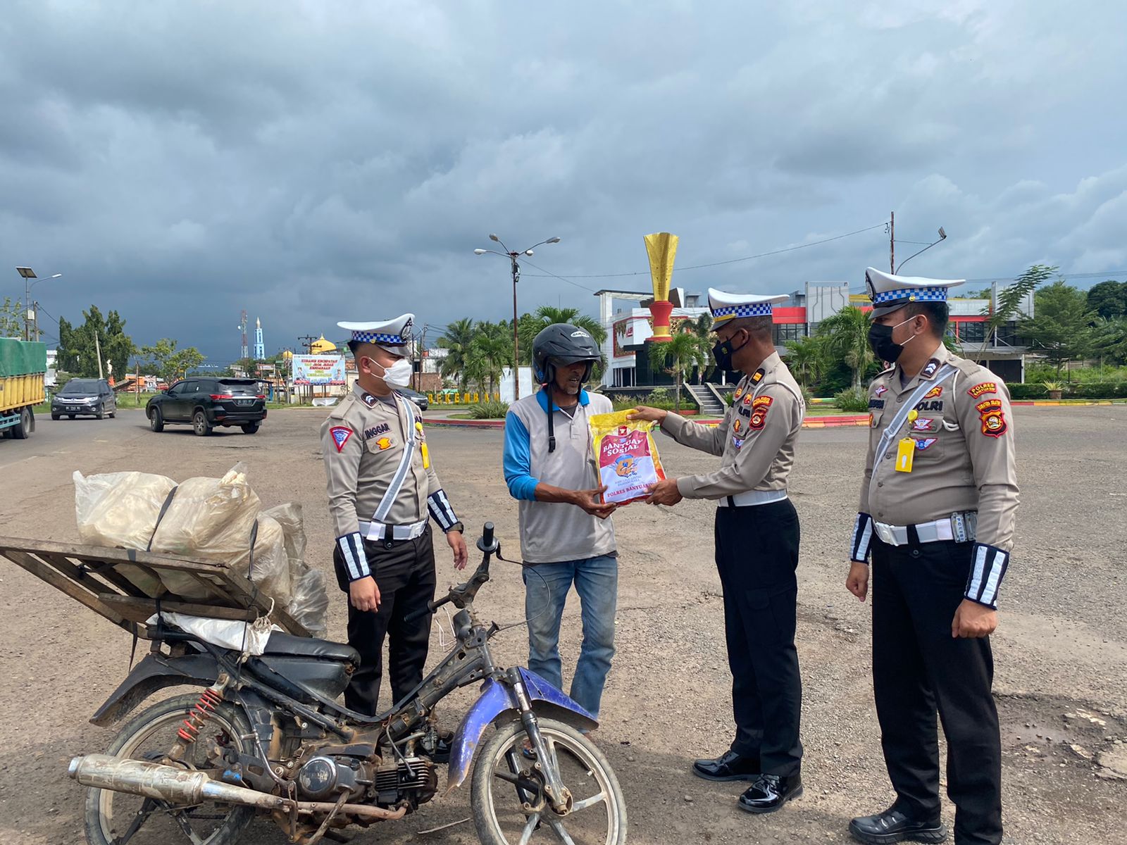 Menurut Kapolres Banyuasin AKPB Imam Syafi’i melalui Kasat Lantas AKP Ricky Mozam menjelaskan dalam giat kali ini membagikan paket sembako kepada pengguna jalan yang tertib berlalu lintas, mereka kami berikan paket sembako, ujar AKP Ricky Mozam.