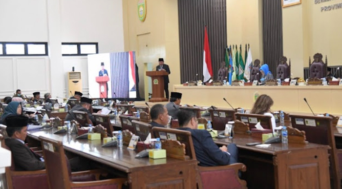 PALEMBANG I KABARINTI COM I Pimpinan dan anggota DPRD Sumsel mendengarkan penjelasan Gubernur terhadap Raperda pertanggung jawaban pelaksanaan APBD Sumsel tahun anggaran 2021 pada rapat paripurna hari ini, Rabu (8/6/2022).