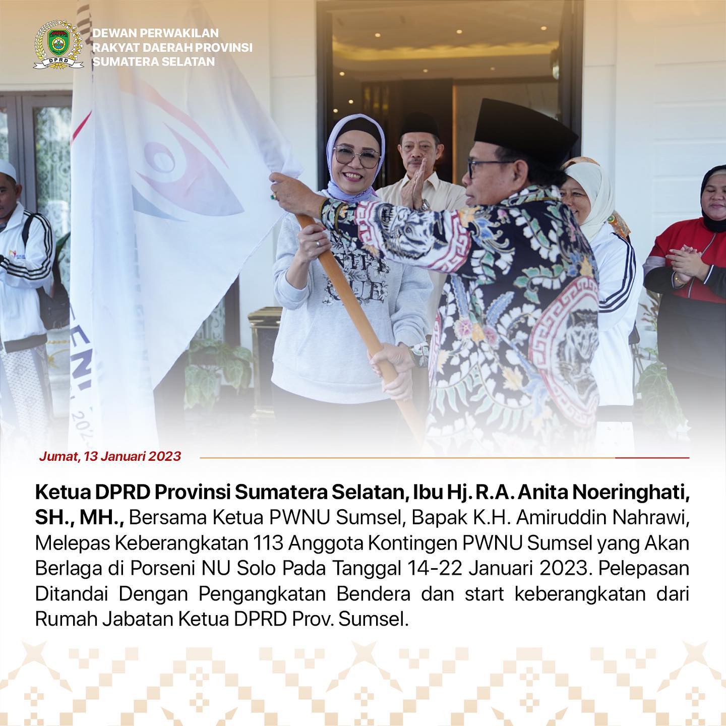 PALEMBANG I KABARINTI.COM I qKetua DPRD Provinsi Sumatera Selatan, Ibu Hj. R.A. Anita Noeringhati, SH., MH., bersama Ketua PWNU Sumsel, K.H. Amiruddin Nahrawi, melepas keberangkatan 113 anggota Kontingen PWNU Sumsel yang akan berlaga di Porseni NU Solo pada tanggal 14-22 Januari 2023.
