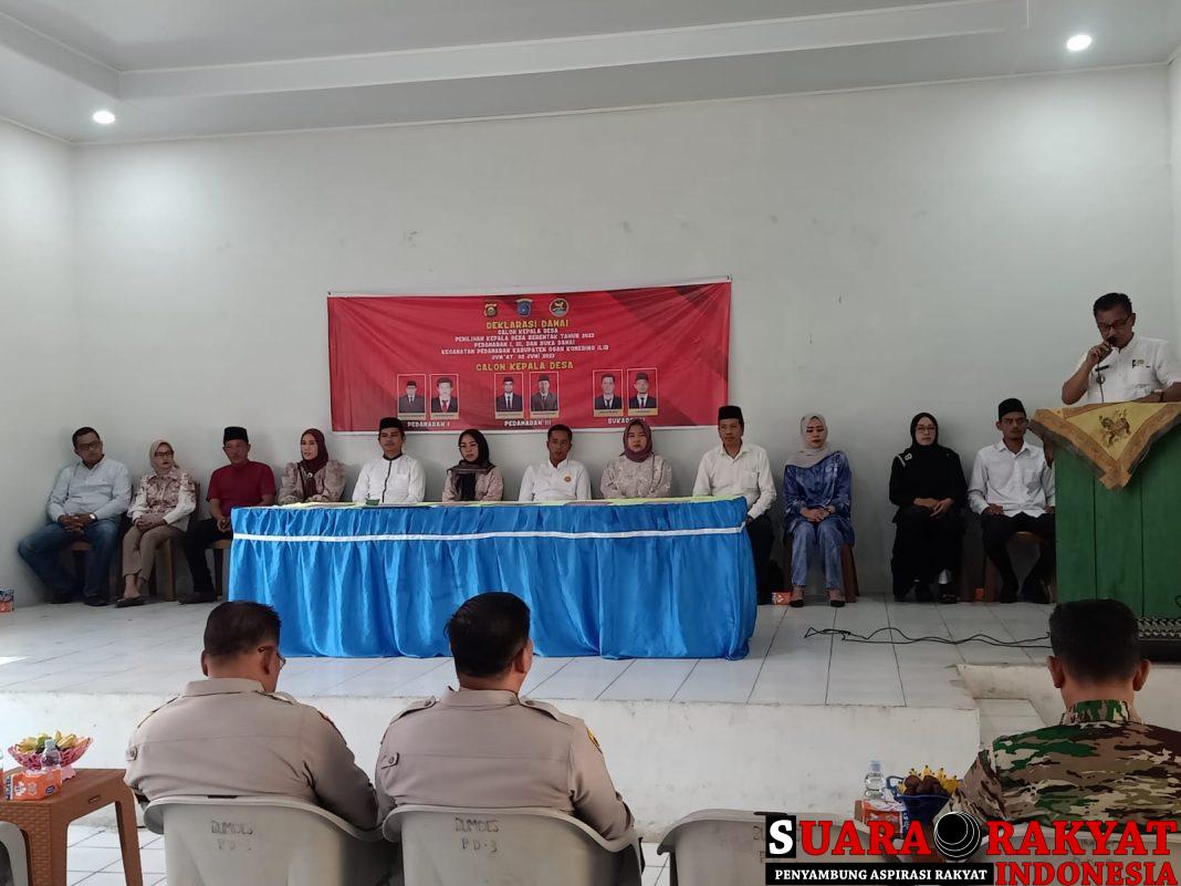 OGAN KOMERING ILIR I KABARINTI.COM I Sebanyak 6 calon kepala desa yang akan mengikuti pemilihan kepala desa (Pilkades) serentak di Kecamatan Pedamaran Kabupaten Ogan Komering Ilir (OKI) tahun 2023, melakukan deklarasi damai di Balai Pertemuan Desa Pedamaran III Kecamatan Pedamaran kabupaten OKI, Jum’at (2/6/23).