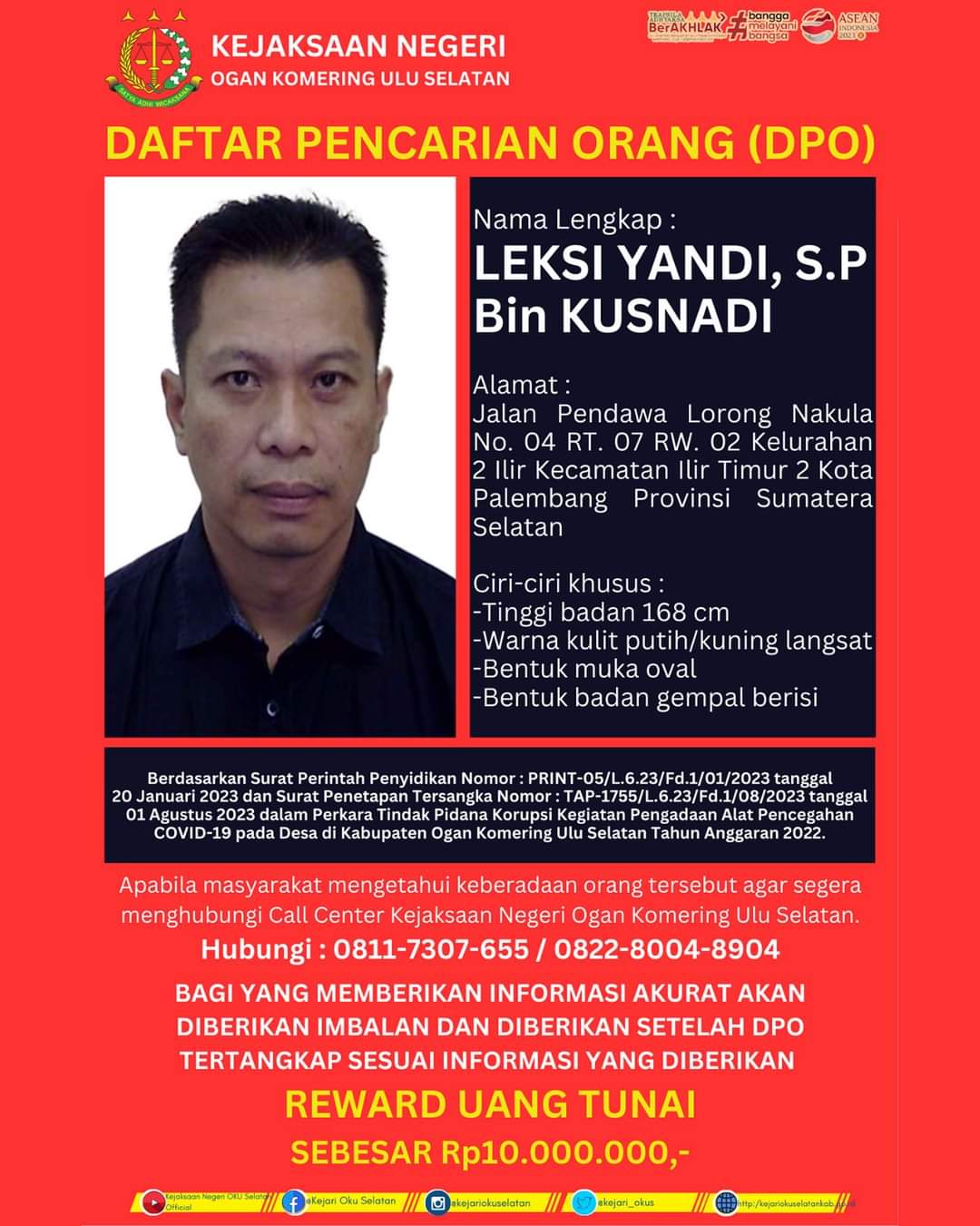 OKU SELATAN I KABARINTI.COM I Kejaksaan Negeri (Kejari) OKU Selatan menggelar sayembara dengan menyediakan hadiah sebesar Rp 10 juta bagi warga yang berhasil menemukan Leksi Yandi seorang koruptor yang melarikan diri dan telah ditetapkan sebagai DPO.